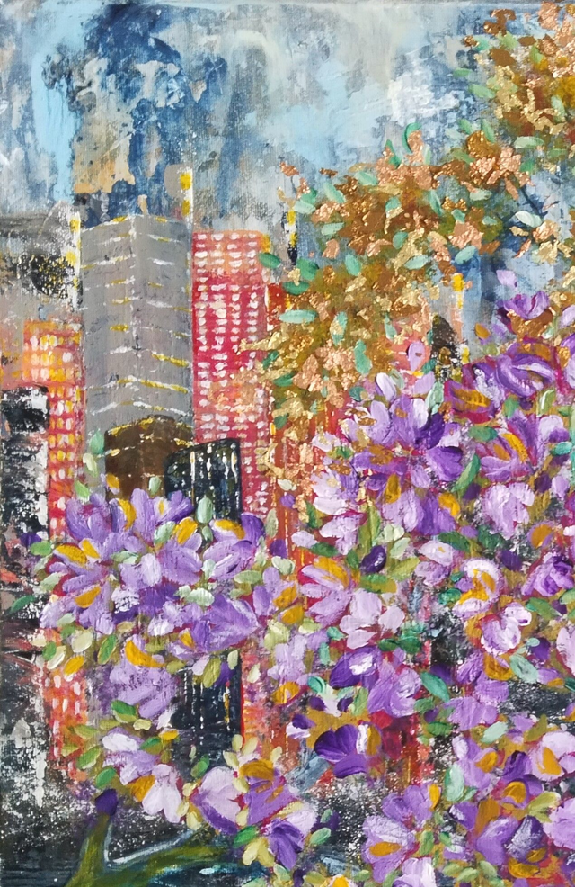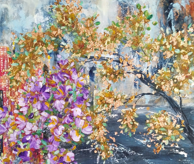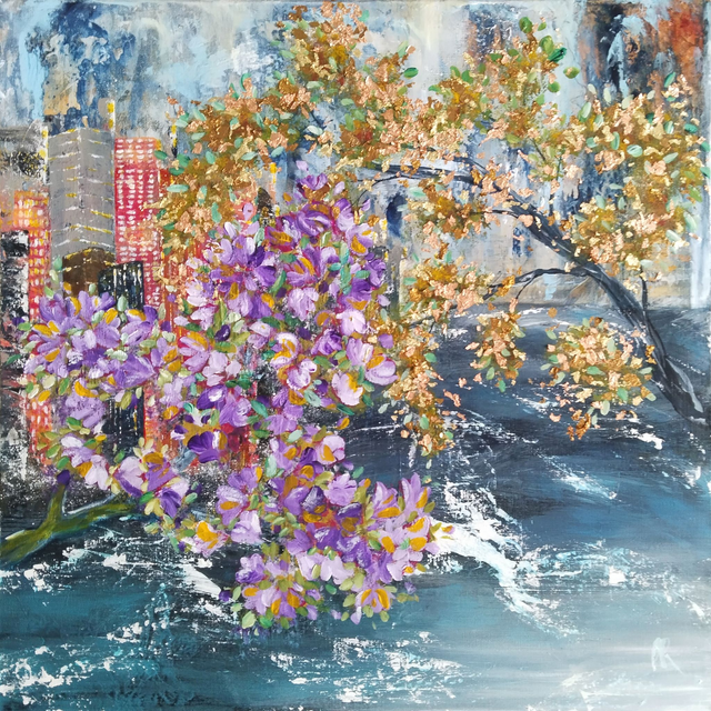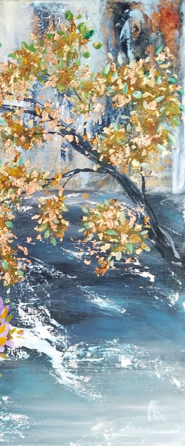 Acrylique sur chassis 3D entoilé de 50x50x3.5 cm. Feuilles dorées et feuilles cuivrées de différentes teintes. Finition vernis.