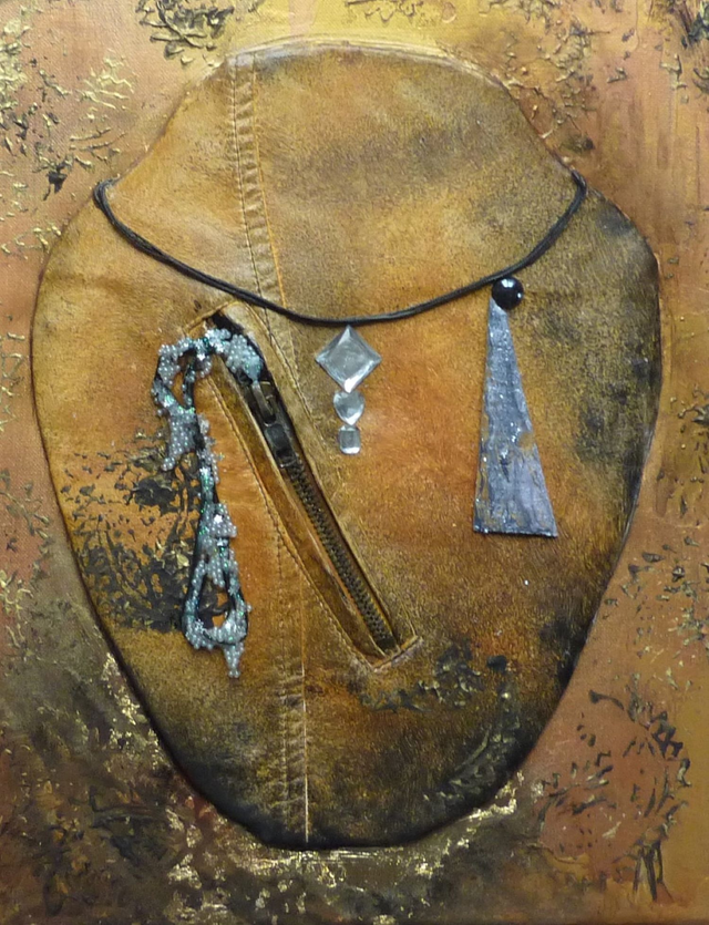 Acrylique, feuille dorée, cartonnages et collages de fausses verreries et divers composants tels du faux cuir sur chassis entoilé de 40x40 cm, finition
