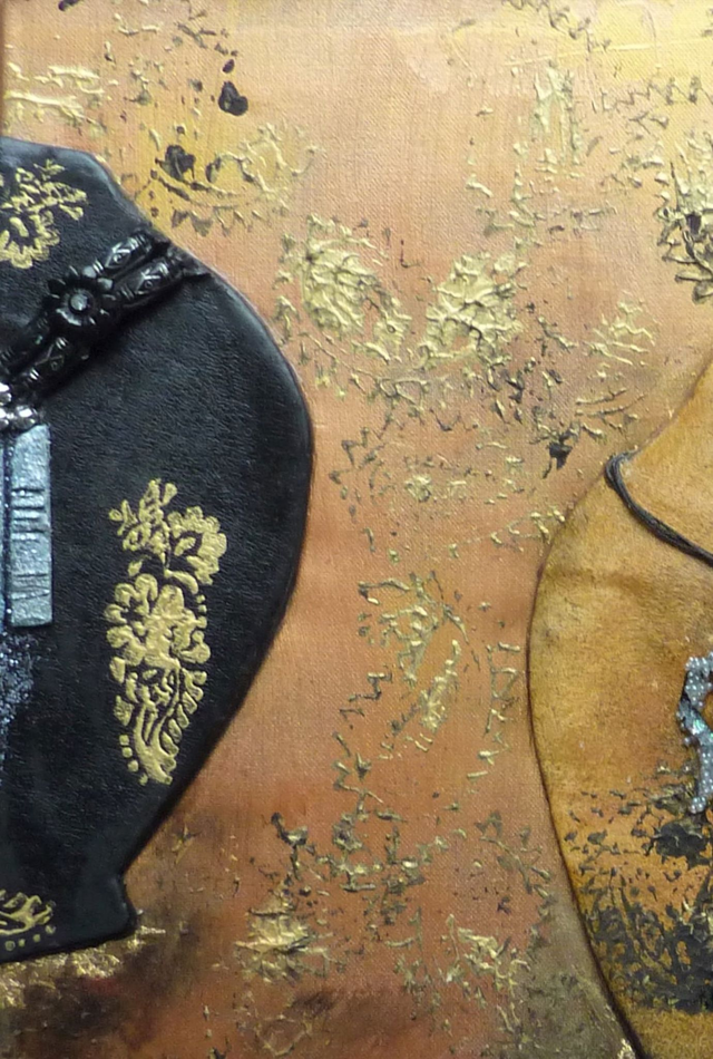 Acrylic, gold leaf, cardboard and collage of faux glassware and various components such as faux leather on 40x40 cm canvas stretcher, varnish finish.