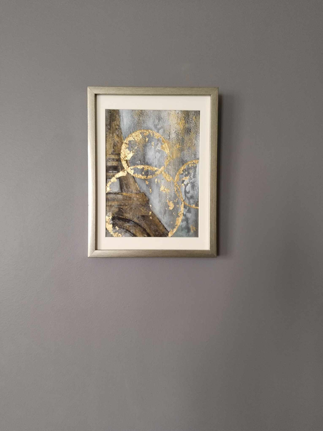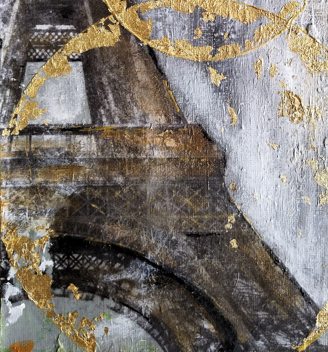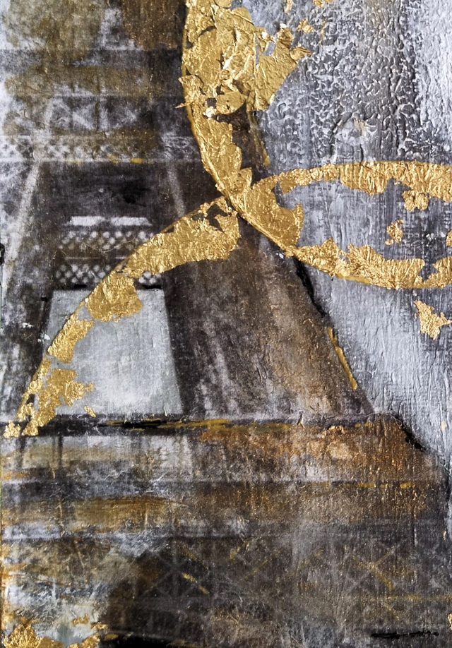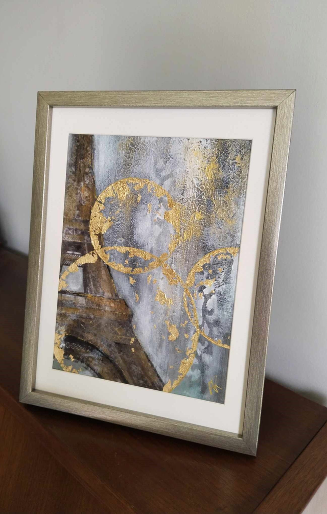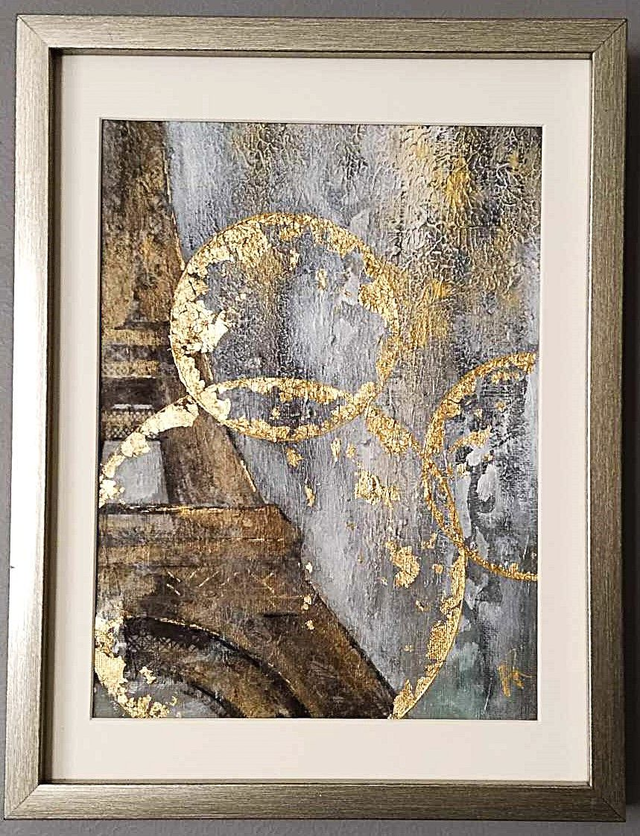 Peinture acrylique, modeling past et feuille dorée et sur toile (finition vernis). Dimensions de l'oeuvre sans cadre : 21 x 15 cm. Encadré dans cadre couleur argentée, dimensions finales 25.7x19.6 cm.