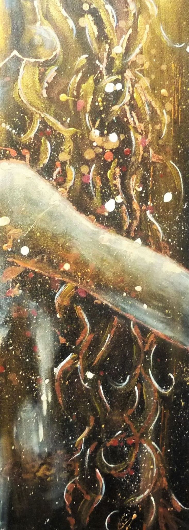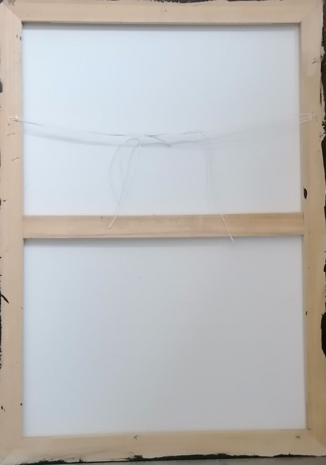 Acrylique sur chassis entoilé de 70x50 cm, feuille métallique, finition vernis. Encadré dans un cadre américain en bois blanc, dimensions totales