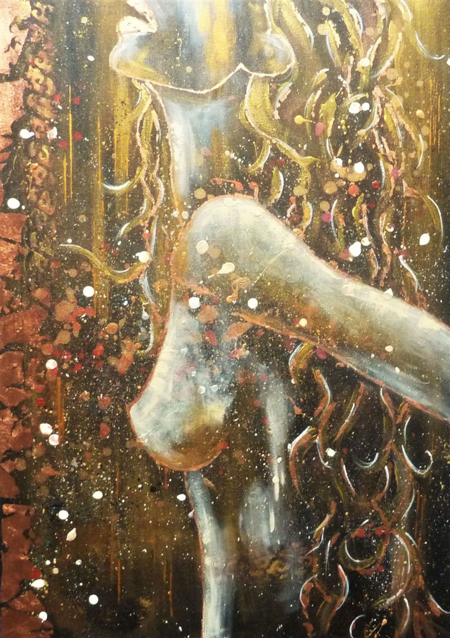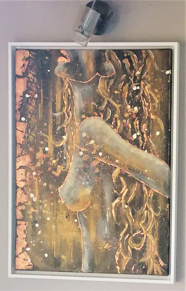 Acrylic on 70x50 cm canvas, metal foil, varnish finish. Framed in an American white wood frame, total dimensions 74x54 cm.