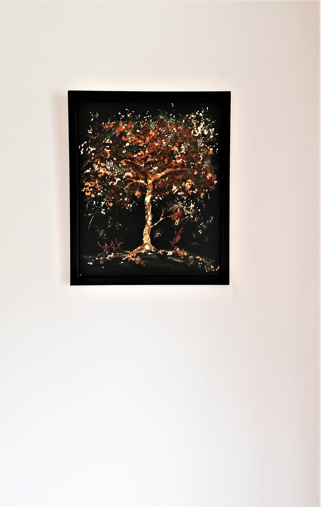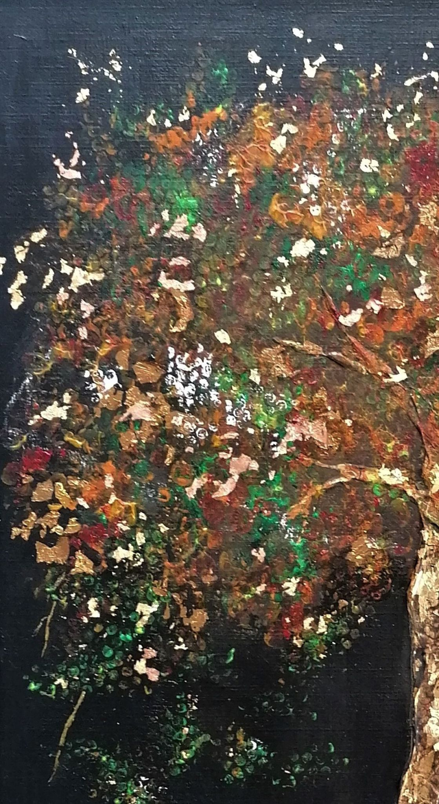 Acrylique sur chassis entoilé de 46x38 cm, et feuilles dorées et cuivrées, empâtements en modelling past pour les reliefs, et collages d'herbes. Finition