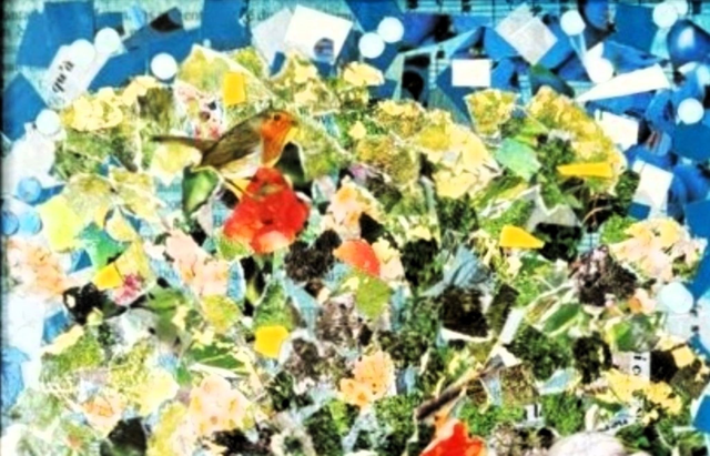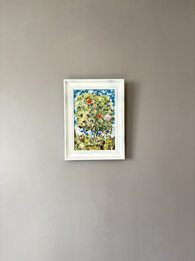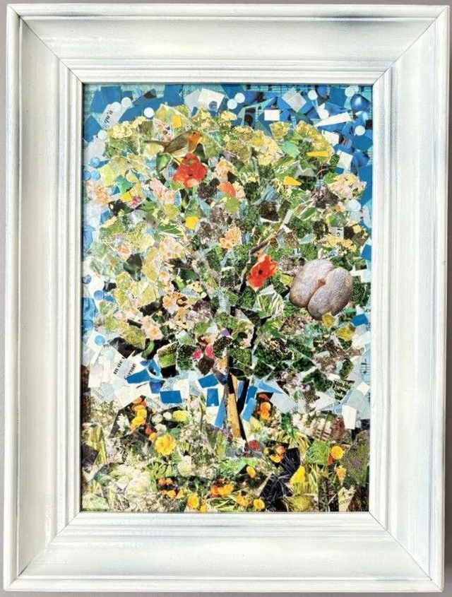 Un petit moineau, curieux voyageur,s’est posé sur un arbre, frôlant le doux feuillage. Là, dans la lumière des papiers découpés,un coco-fesses, étrange fruit des Seychelles, reposait, rêveur. Leur rencontre, fragile et colorée, chuchote à l’arbre un secret de papier : Deux mondes se touchent, le temps d’un regard, et sur le support la nature devient art. Peinture acrylique, éclats de feuille dorée, collages de morceaux de magazines, de feuilles de musique et de pages de livres sur planche de bois. Cadre en bois blanc. Dimensions de l'oeuvre sans cadre : 27 x 19 cm. Dimensions encadrée 33x25 cm.