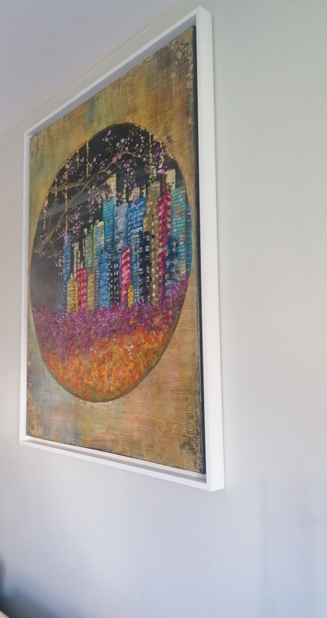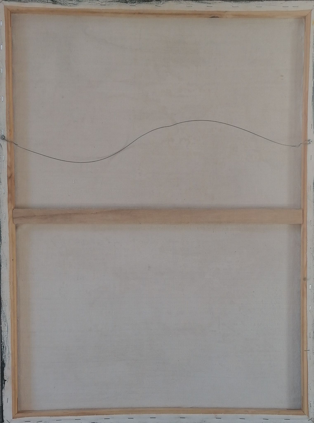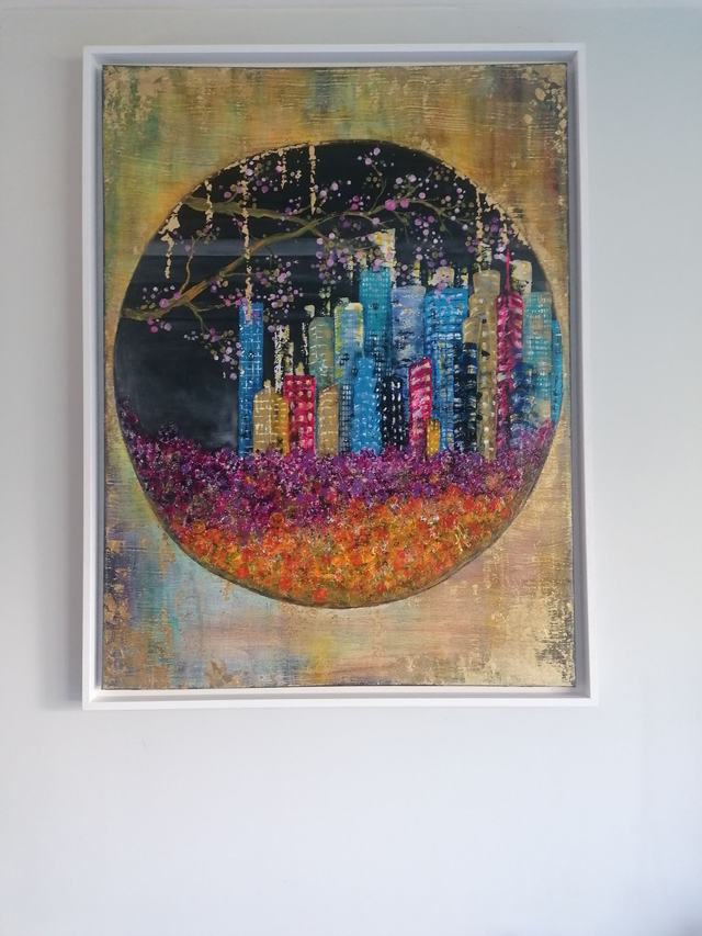Canvas on 79.5x59.5cm stretcher, acrylic, resin on the gold part, varnish finish. Framed in white American wood, final size 84x64 cm.