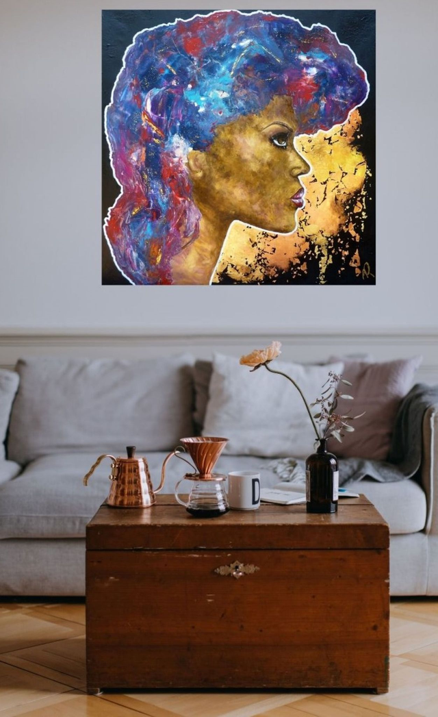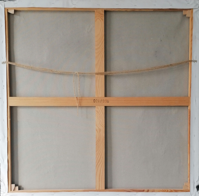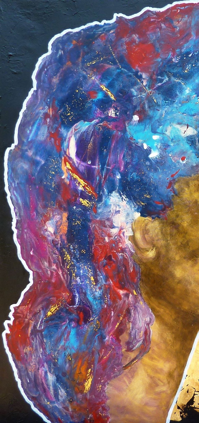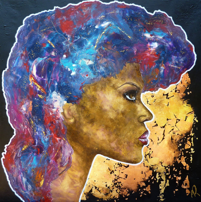 Chassis entoilé de 100x100x2 cm, acrylique et pouring. Petits reliefs sur le fond noir. Feuille dorée et feuille cuivrée. Finition vernis.
