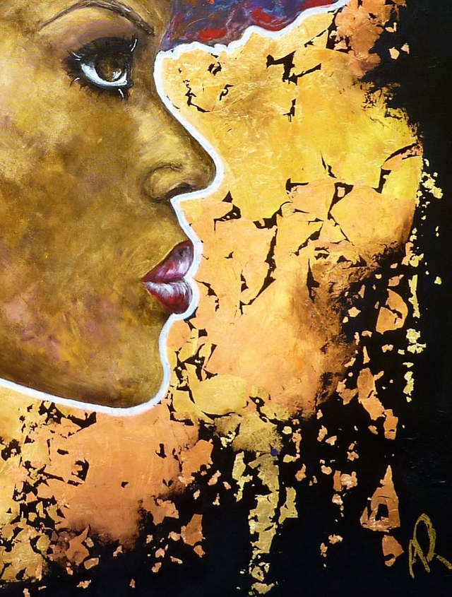 100x100x2 cm canvas frame, acrylic and pouring. Small reliefs on black background. Gold leaf and copper leaf. Varnish finish.