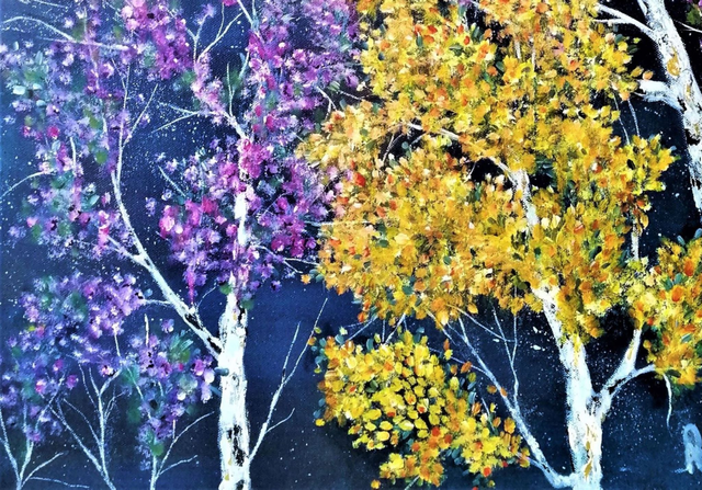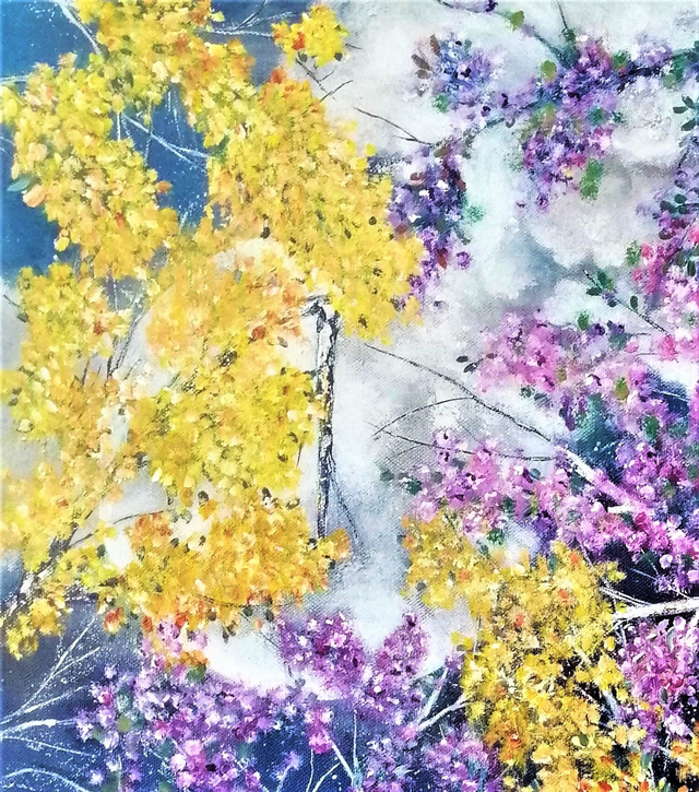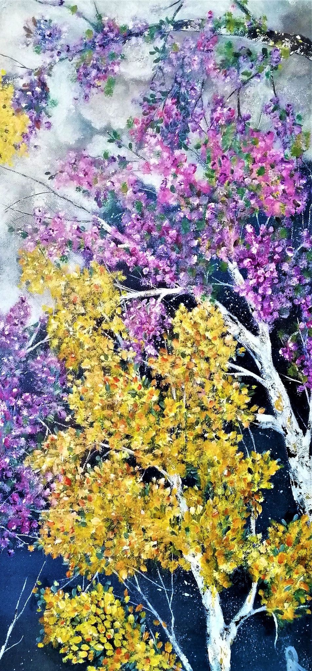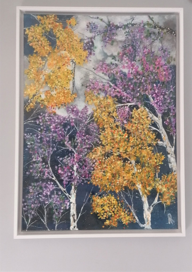 Acrylique sur chassis entoilé de 70x50 cm, finition vernis. Encadré dans un cadre américain en bois blanc, dimensions totales 74x54 cm.