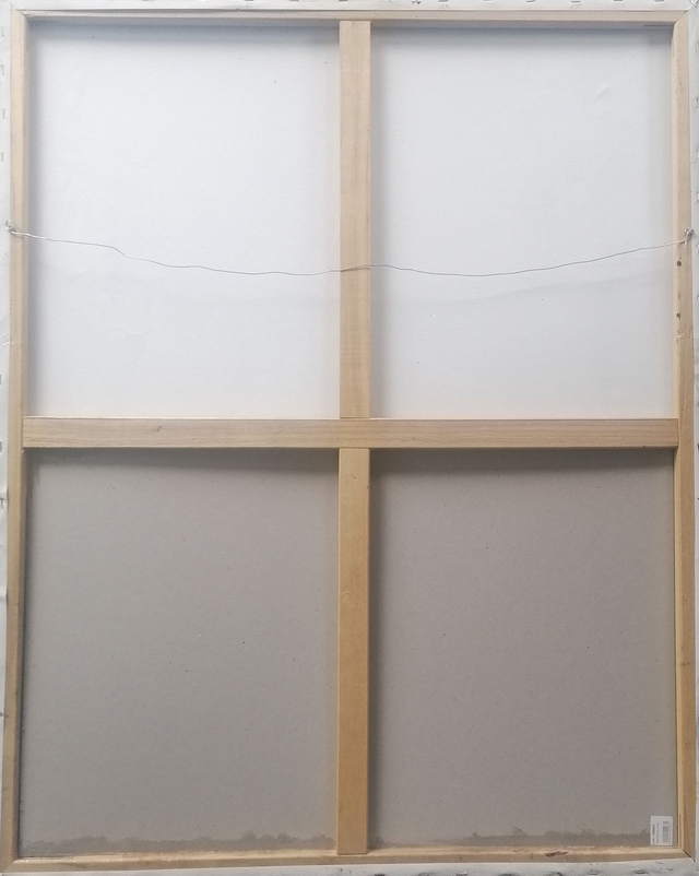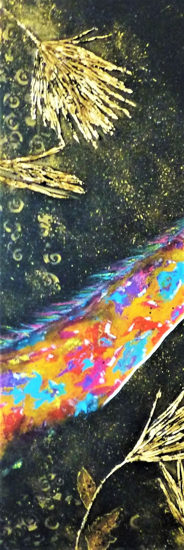 Technique mixte et collages de bois et feuillages sur châssis entoilé de 100x80 cm, feuilles métalliques dorées et cuivrées, finition vernis. Dos en la toile en partie cartonné par simple souci d'esthétique, à cause de quelques marques dues sur l'arrière aux collages les plus épais.