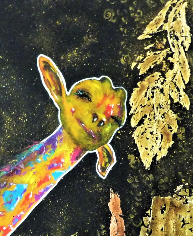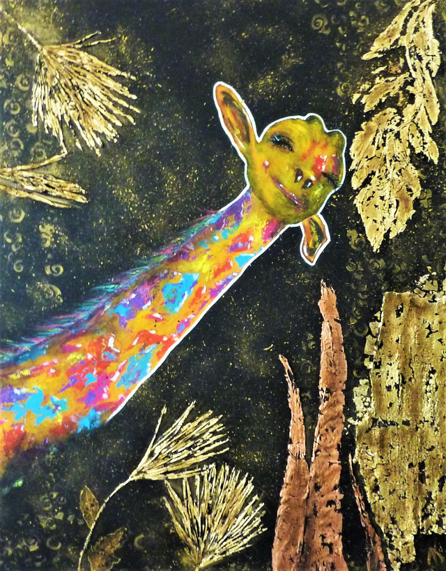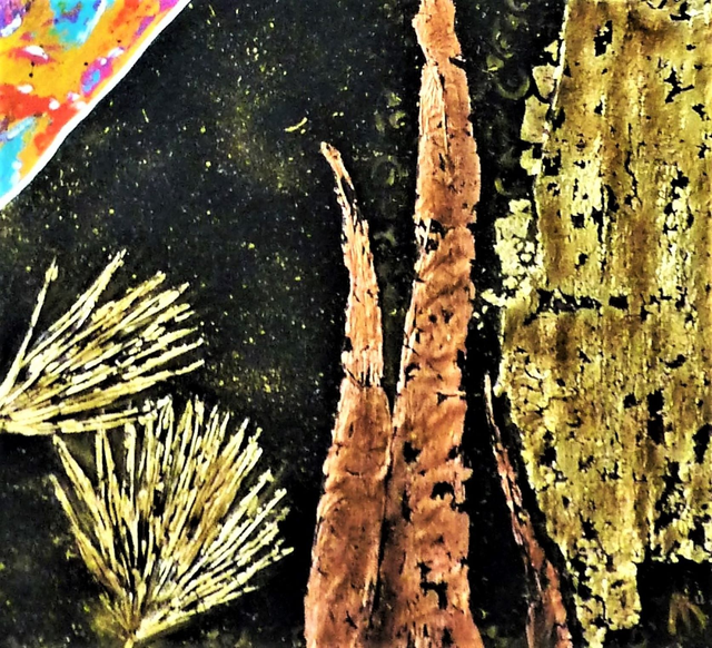 Mixed media and collages of wood and foliage on 100x80 cm canvas stretcher, gilded and copper-plated metal leaves, varnished finish. The back of the canvas is partly cardboard for aesthetic reasons, due to some marks on the back from the thicker collages.