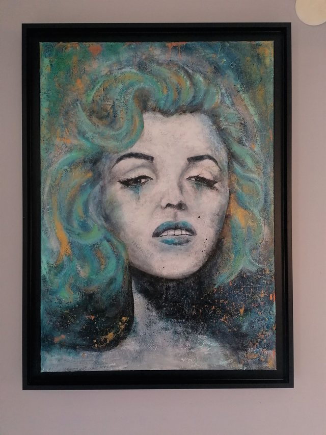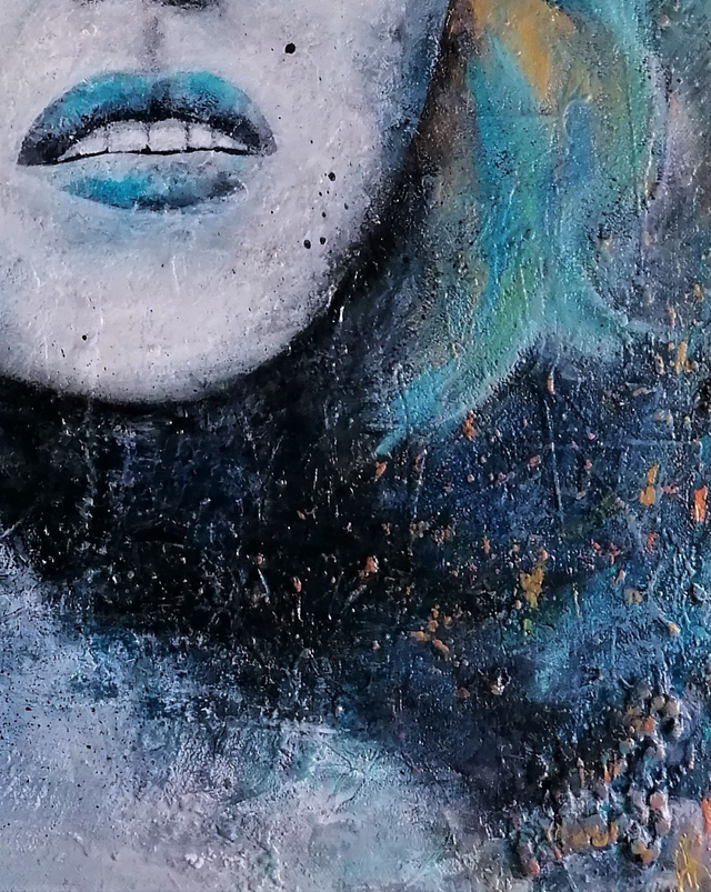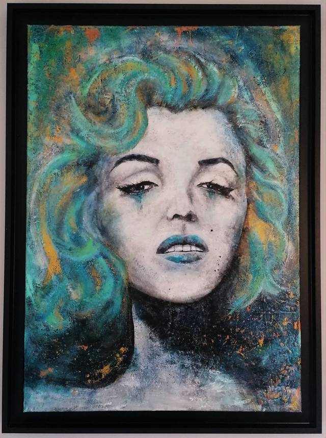 Acrylic on 70x50 cm canvas, previously coated with paste to create reliefs and irregularities, framed in a black American frame that contrasts with the