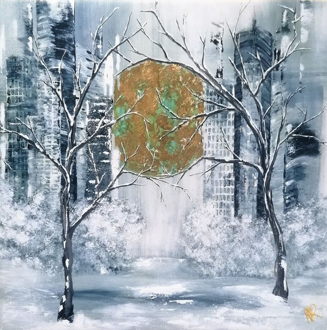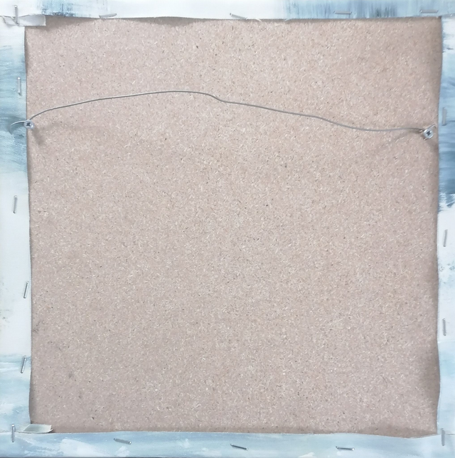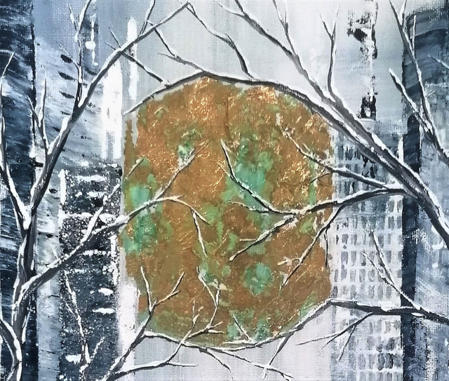 Acrylique et feuille dorée oxydée à la main sur toile tendue sur une planche de bois de 30x30 cm. Finition vernis.