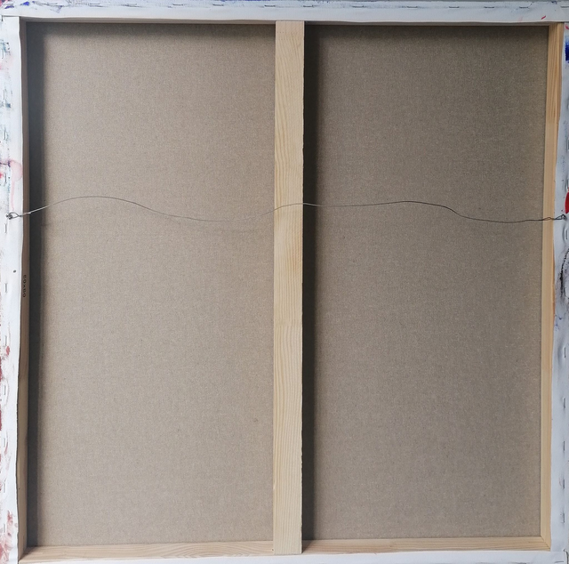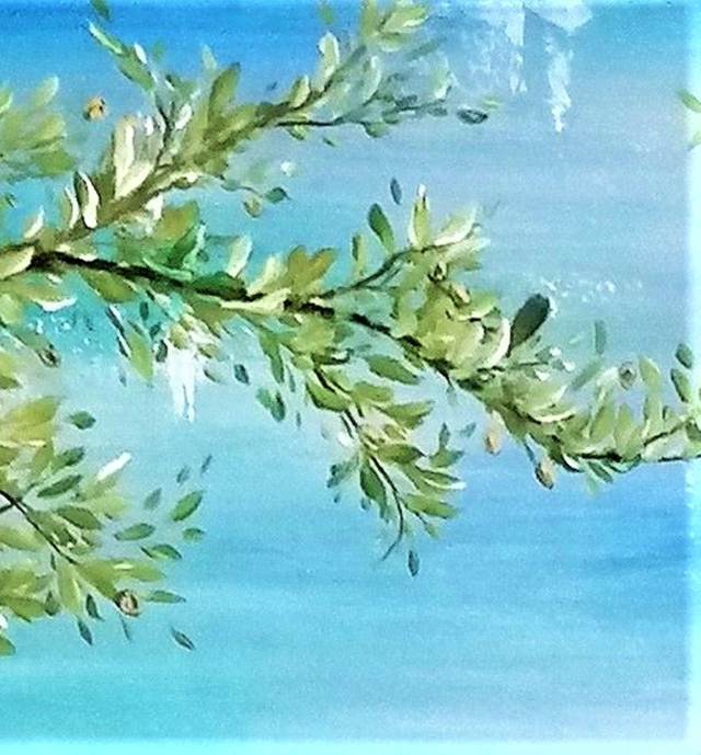 Canvas on 80x80x4 cm 3D stretcher, acrylic paint, small reliefs in places, collage of a few sprigs of genuine lavender, a few olive leaves, light touches of gold mirror leaves. Varnish finish.