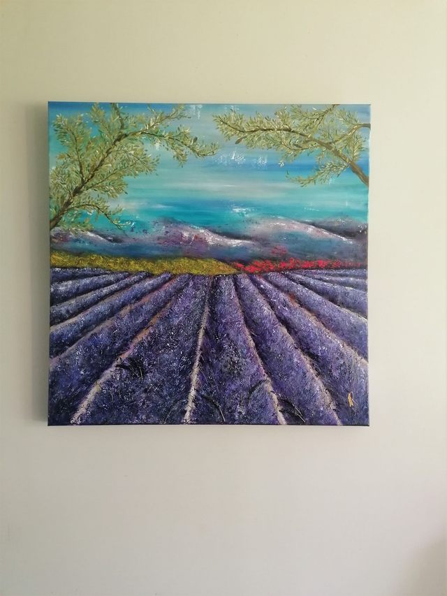 Toile sur chassis 3D de 80x80x4 cm, peinture acrylique, petits reliefs par endroits, collage de quelques brins de véritable lavande, de quelques feuilles d'olivier, légères touches de feuilles miroir dorées. Finition vernis.