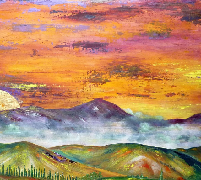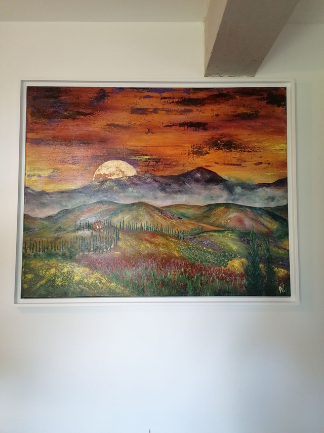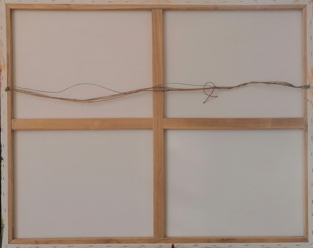 Acrylic and lime on 80 x 100 cm canvas, varnished finish. Framed in an American white wood frame, final size 86x106 cm.