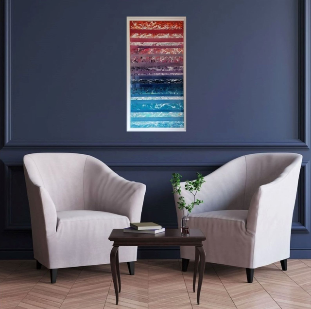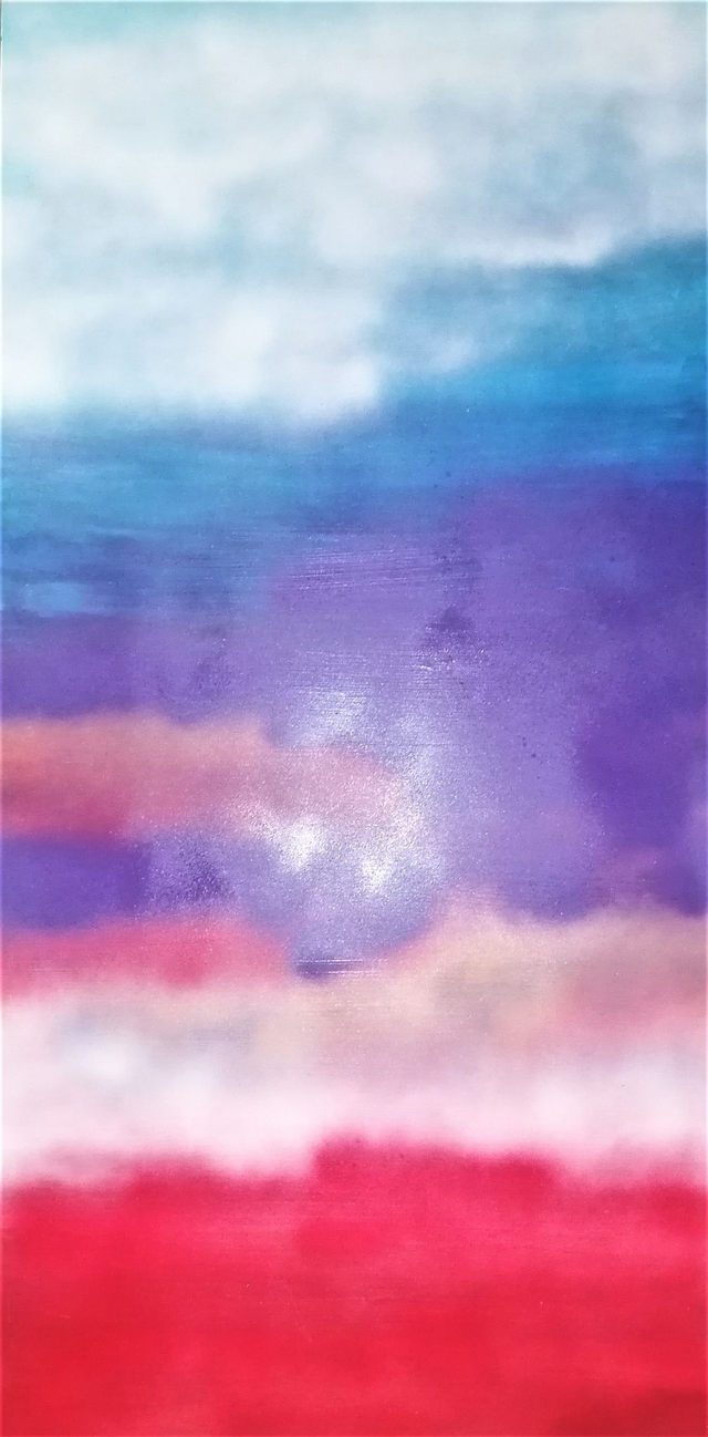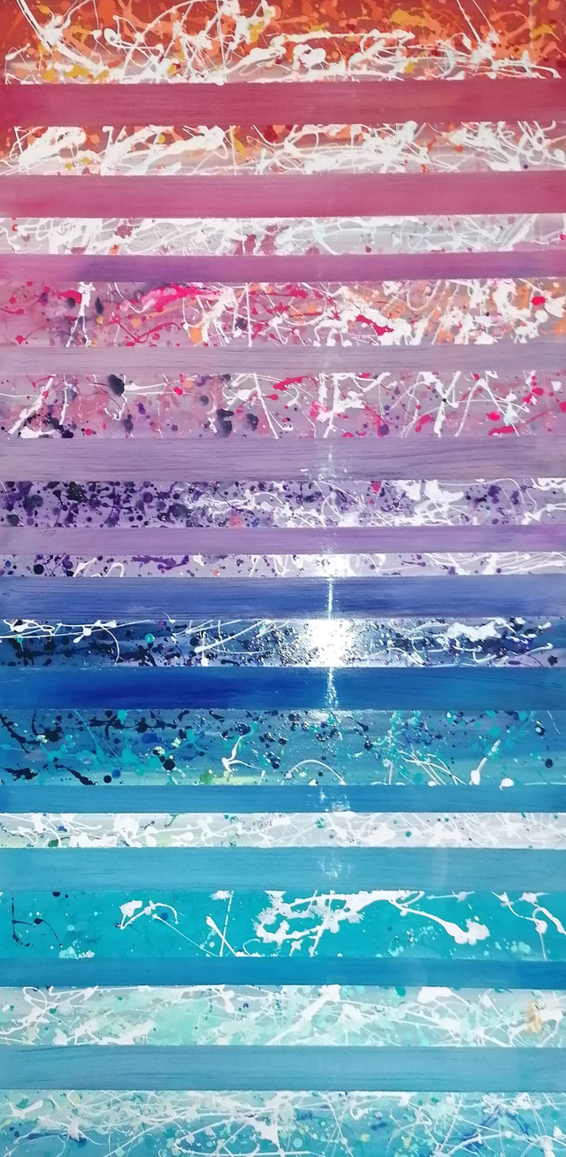 Acrylic painting on 100x50 cm Plexiglas, painted on the front and back. Framed in a white American wood frame. Final dimensions 105x56 cm. Varnish
