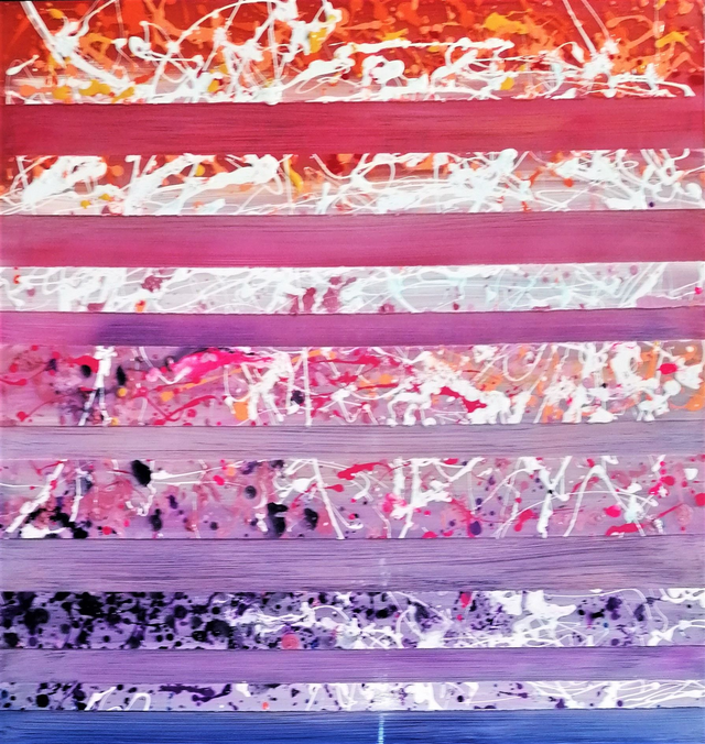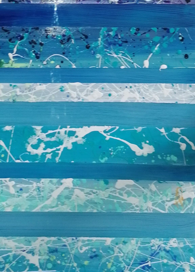 Peinture acrylique sur plaque de plexiglas de 100x50 cm, peinte sur le devant, et sur le verso. Elle est encadrée dans un cadre américain en bois blanc. Dimensions finales 105x56 cm. Finition vernis.