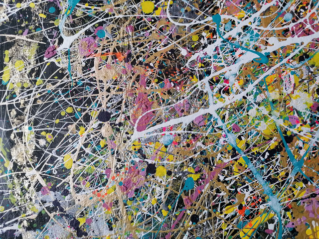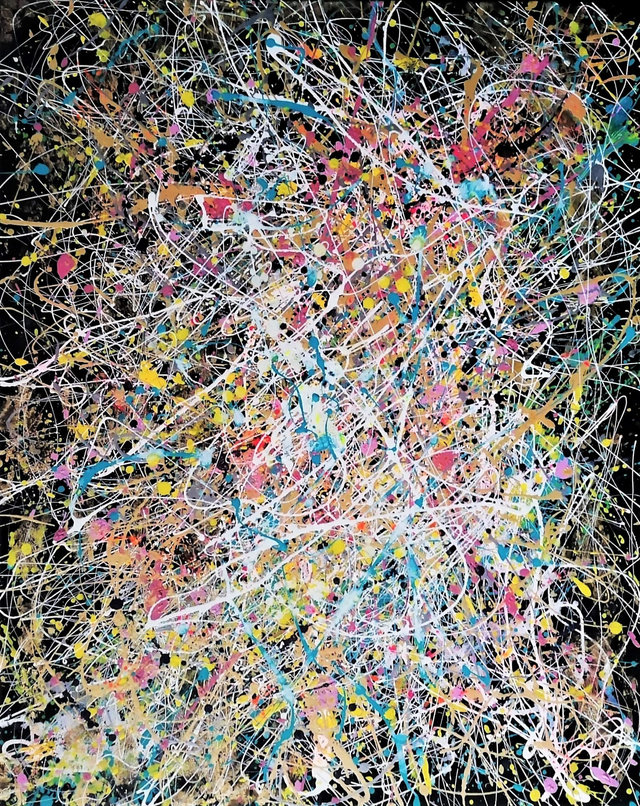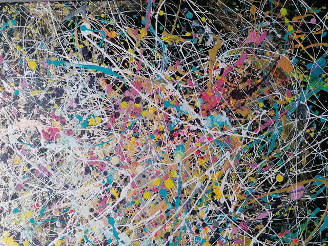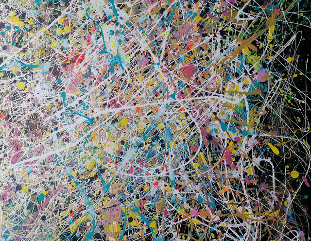 Acrylic painting with the addition of a few dots of gold leaf on canvas with 80x100cm frame. Black American frame, total size: 86x105.7 cm, varnish