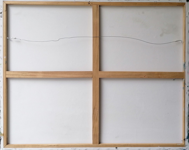 Peinture acrylique avec ajouts de quelques points de feuilles dorées sur toile avec chassis de 80x100cm . Encadrement cadre américain noir, taille